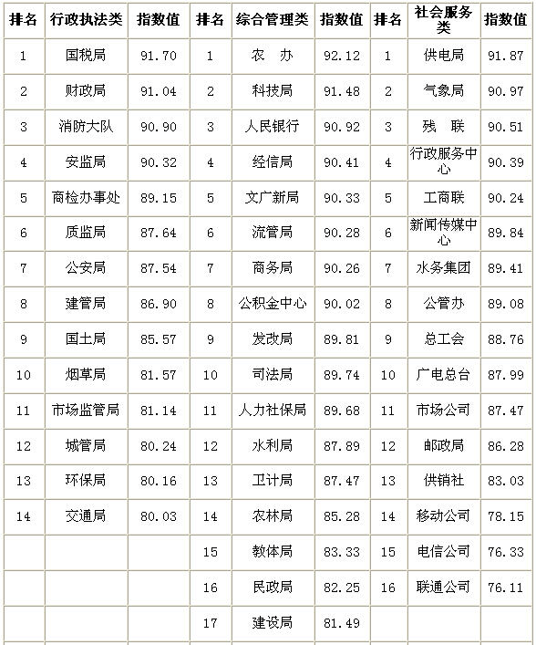 市级部门软环境指数分类排名