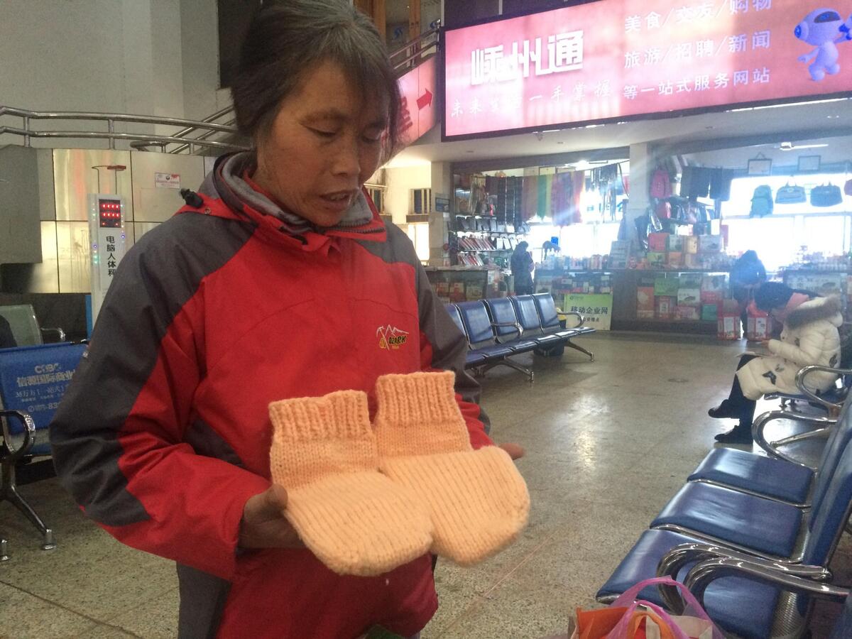 在梁妈妈的行李中,有一双嫩黄色的毛线袜套特别吸引记者的目光。她说,这是她自己拆了旧毛衣帮女儿织的,“她的脚特别怕冷,我就想着能让她暖和一点。”梁妈妈说道,虽然织的不好,但女儿穿上后双脚肯定能暖和些。