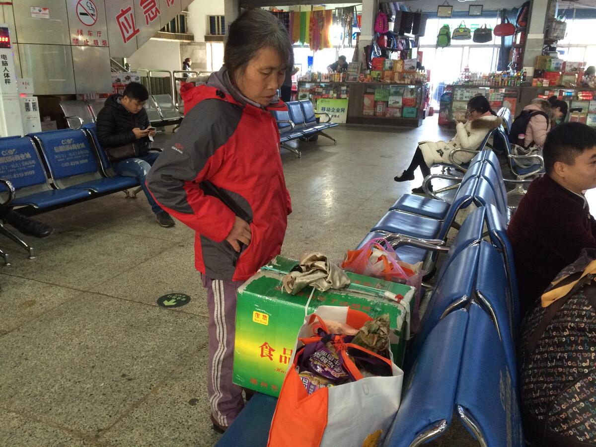 2月5日一大早,梁妈妈怕东西太多耽误上车时间,早早地就提着大包小包赶到了客运中心。