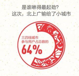 从地区分布看,三四线城市的参与用户占比达到了64%,明显超过了一二线城市,在中小城市中,江西赣州、河南周口、山西运城位列前三,他们和北上广的观众一样,成为了春晚抢红包的主力。