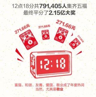 在今年的春晚上,让许多网友望穿秋水的“敬业福”终于有了着落,最终,有791,405位用户集齐了五福,平分了2.15亿的大奖,平均每人得到271.66元,赢得了一份开年彩头。