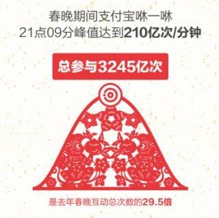 在春晚进行当中,支付宝“咻一咻”互动平台总参与次数达到3245亿次,是去年春晚红包互动次数的29.5倍,在21点09分,用户的参与热情达到了顶峰,“咻一咻”峰值达到210亿次/分钟。