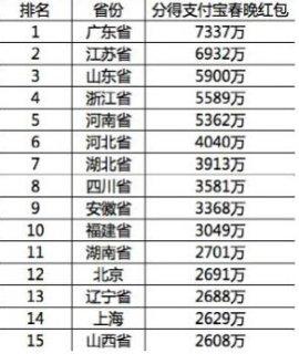 数据显示,抢红包最热情的观众来自广东,他们共抢得7337万元,江苏和山东两省紧随其后,而浙江人,在除夕夜总计抢到了5589万红包,在全国排名第四。
