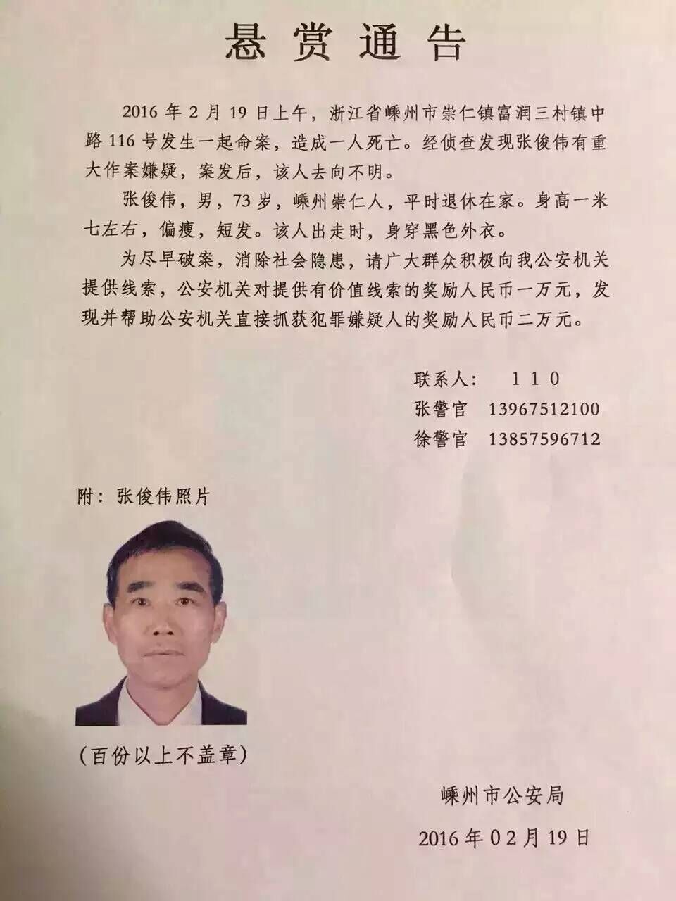 崇仁昨发生一起命案 市公安局发悬赏通告