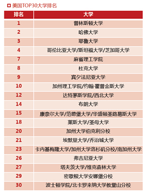 此外,《白皮书》还提供了一份美国TOP30大学的榜单,为您留美提供系统的参考。