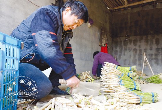 昨日,开发区(浦口街道)屠家埠村的种植户正在整理捆扎刚采收的鲜芦笋。