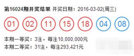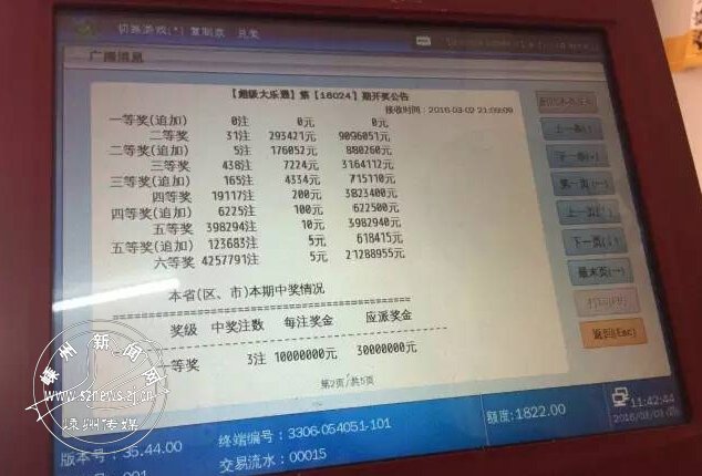 3月2日晚,体彩超级大乐透第16024期开奖,全国中出3注一等奖,单注奖金1000万元。3注一等奖均出自我市同一家体彩销售网点,且打印时间前后仅相差几秒,因此该网点中出3000万元的体彩大奖。值得一提的是,这次的3000万元大奖是浙江体彩自2015年以来开出的最高奖金。