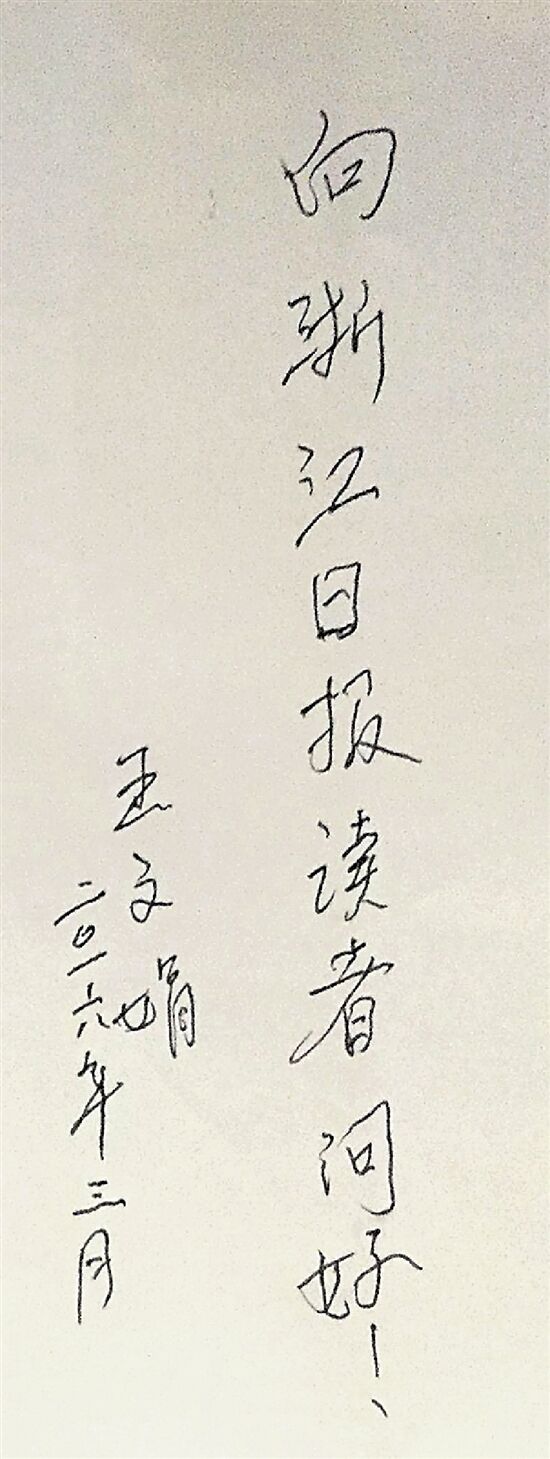 当记者告诉她,在浙江很多地方的小学里都开始教越剧,不久前获批建立的浙江音乐学院更是专门招收了40名越剧学生时,王文娟满是振奋:“越剧在浙江会有很多潜力和发展,相信年轻人能创作出好的作品,让越剧这朵花开得更鲜更艳。”她欣然提笔写下“向浙江日报读者问好!”