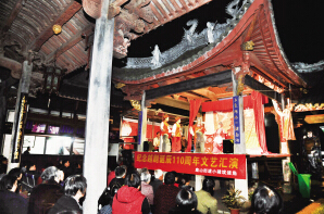 昨晚,嵊州市鹿山街道小砩村赵家祠堂的戏台上正在演出折子戏。记者何雯 樊蕾摄