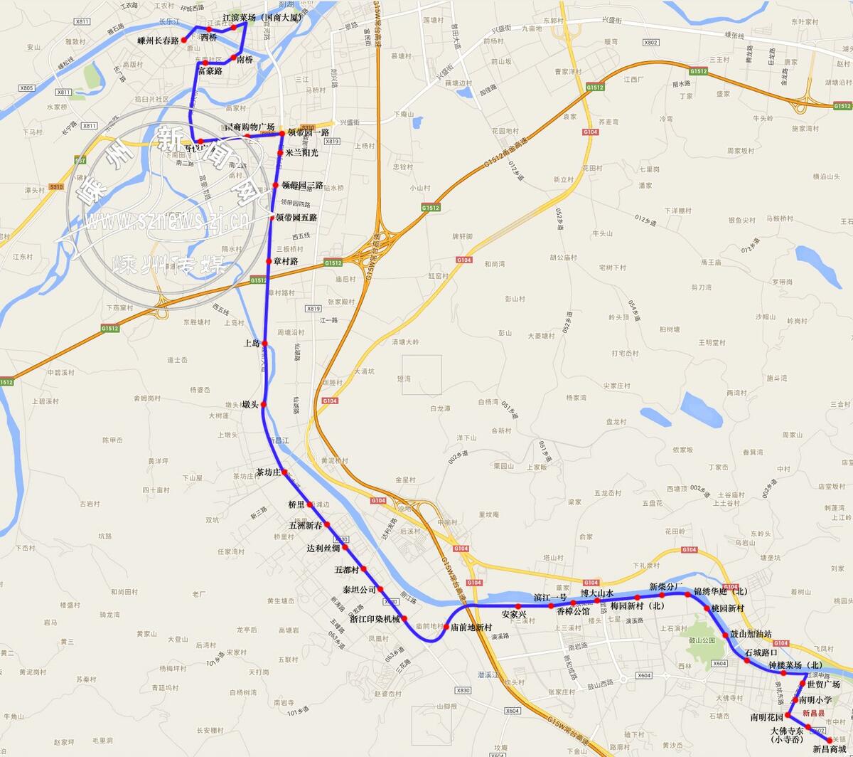 具体线路走向为:嵊州长春路(首末站)→西桥→江滨市场(国商大厦)→南桥→富豪路→吾悦广场→国商购物广场→领带园一路→米兰阳光→领带园三路→领带园五路→章村路→上岛→墩头→茶坊庄→桥里→五洲新春→达利丝绸→五都村→泰坦公司→浙江印染机械→庙前地新村→安家兴→滨江一号→香樟公馆→博大山水→梅园新村(北)→新柴分厂→锦绣华庭(北)→桃源新村→鼓山加油站→石城路口→钟楼菜场(北)→世贸广场→南明小学→南明花园→大佛城东(小寺岙)→新昌商城。