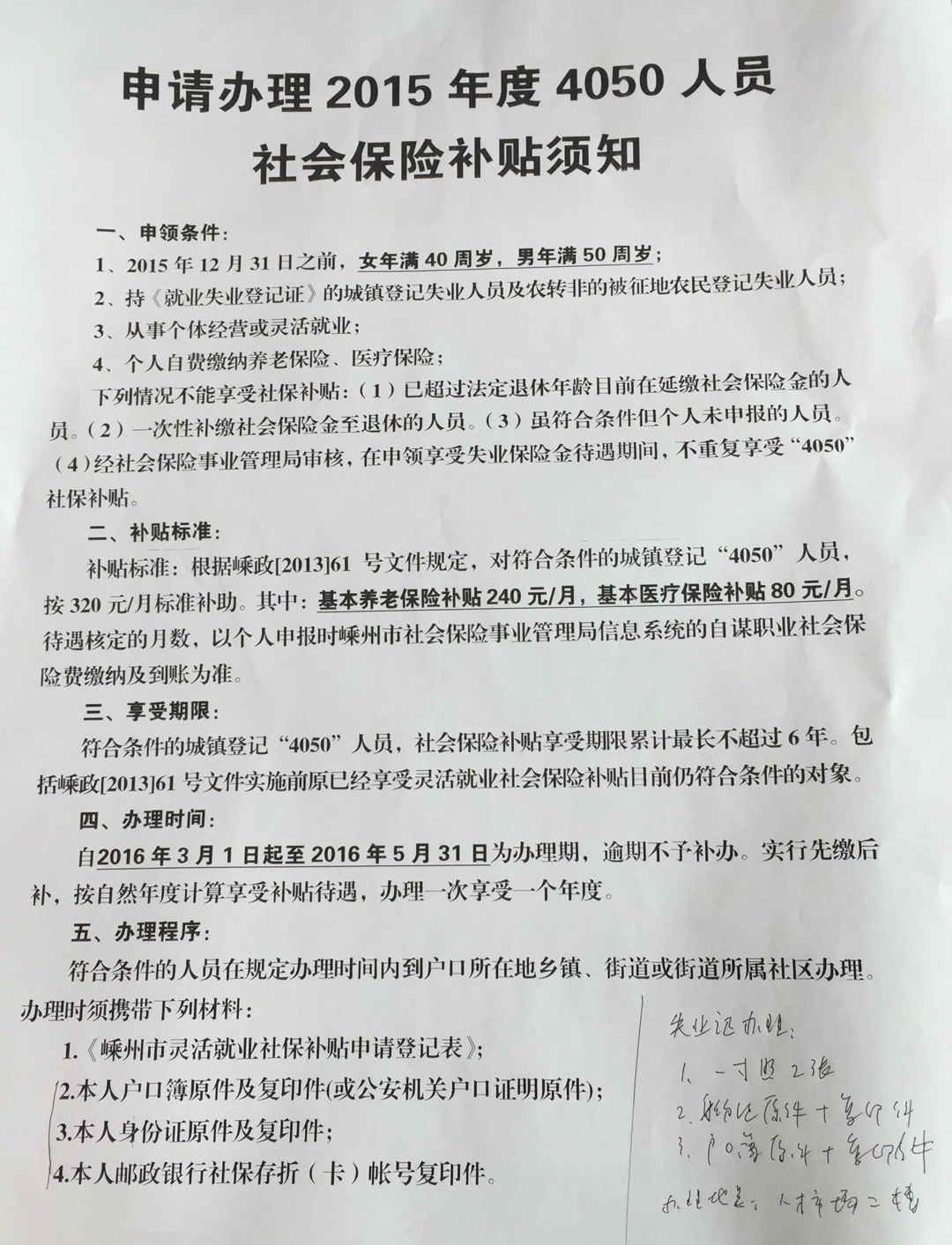 申请办理2015年度4050人员社会保险补贴须知