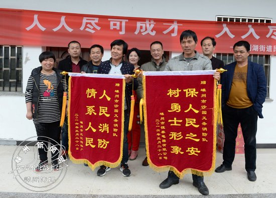 3月30日上午,市三江泡沫厂和恒泰电器有限公司的两位企业主,拿着写有“保人民之安树勇士形象”锦旗,前往剡湖街道沙园村义务消防队进行慰问。