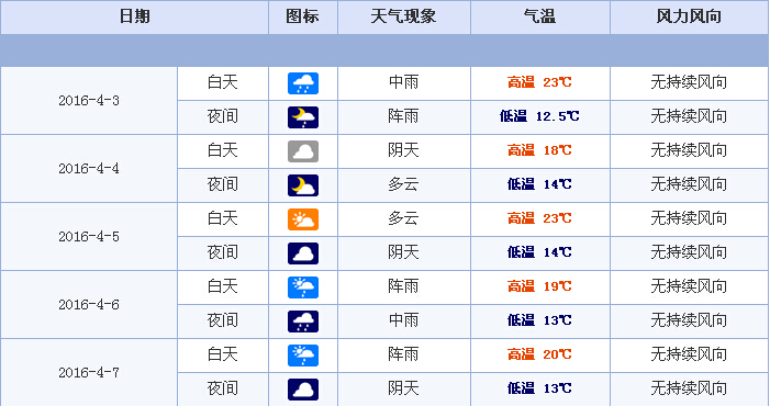 4月3日星期日:阴有阵雨或雷雨 16~23℃