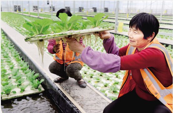 3月29日,嵊州市甘霖镇绿城现代农业综合体内,工人正在察看水培蔬菜的长势。该综合体种植面积6000亩,主要种植无公害水果、蔬菜等,今年开始种植四季水培蔬菜,供应绍兴各地市场。