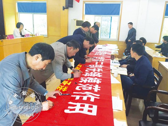 昨日上午,甘霖镇71个行政村的党组织负责人在“发挥党支部战斗堡垒党员干部先锋模范作用——环境整治我承诺”宣传横幅上签名,承诺对环境整治的决心和信心。