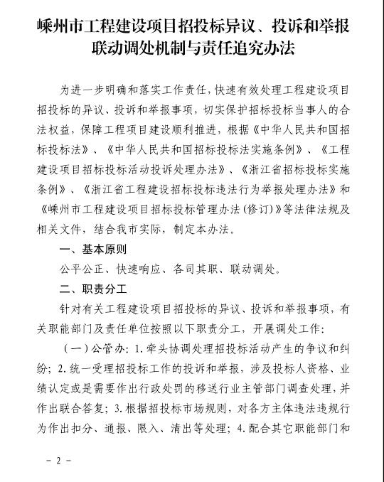 关于印发《嵊州市工程建设项目招投标异议、投诉和举报联动调处机制与责任追究办法》的通知