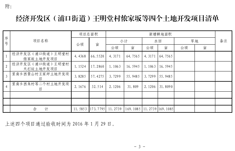 市府办关于开发区(浦口街道)王明堂村侬家坂等四个土地开发项目通过市级验收认定的通知
