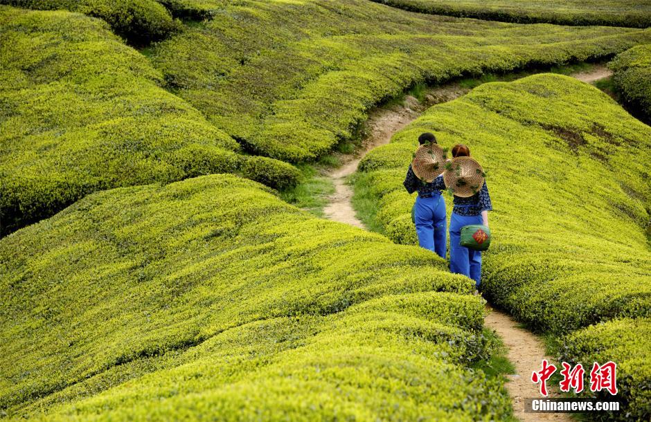 4月,随着气温逐升高,茶叶进入采摘高峰期,靓丽的采茶姑娘成为茶园的风景线。4月13日,浙江嵊州通源通过举办茶叶炒制、茗茶品鉴、茶园观光、诗画创作等系列茶文化活动,传承茶叶文明,传播茶叶文化。中新社记者陈君摄