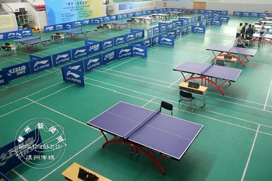 4月29日至5月1日,“李宁·红双喜杯”2016年中国乒乓球协会会员联赛——浙江嵊州永盛站比赛在市体育馆举行,届时来自全国各地包括香港地区在内的60支代表队473名民间乒乓球高手角逐大赛,这是我市首次承办全国性业余高水平乒乓球赛事。图为比赛场地。