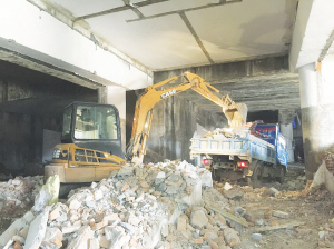 5月13日,江滨市场南桥北引桥下的违法建设全部拆除,比原计划提前三天完成。拆除后,市建设局当即组织30多名工人,两台大型机械,20多辆运输车对拆下建筑垃圾进行清理(如图)。据悉,南桥北引桥下建筑垃圾清理后将修建停车场。