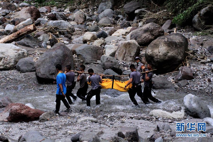 5月16日,在印度尼西亚北苏门答腊省,救援人员抬着一具洪水遇难者的遗体。印度尼西亚官员16日说,北苏门答腊省一处旅游景点15日发生山洪,目前已造成至少15名游客死亡,多人失踪。新华社发