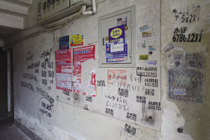 记者在越秀里几个单元里观察到,遍地的小广告有的只剩下模糊的轮廓,而大多数很清晰,覆盖在旧广告上,像补丁一样。“你看不到贴广告的人,他们都是夜里贴的。”住户们说。