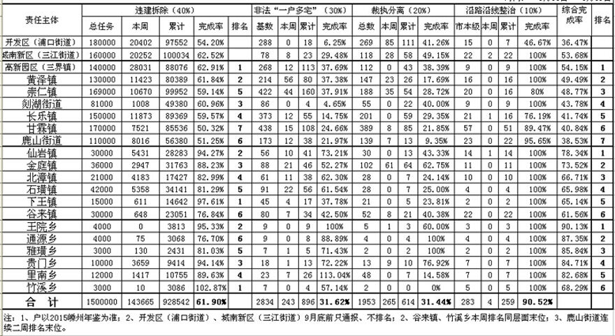 嵊州市“违法建筑大整治行动”一周完成情况综合排名表
