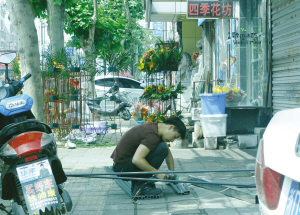 在东南路,一大早,临街的店铺就开门忙着招揽生意了。花店老板摆出各式新鲜花篮,门窗店伙计拿出金属窗框点焊,一阵忙碌后,人行道被拦腰斩断,连盲道上都摆放着各种商品,路过的行人只能走下人行道,绕到非机动车道继续前行。