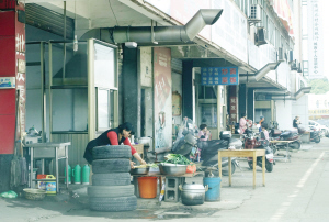 在客运西站边,小笼包店、面菜馆等餐饮店早早将桌椅板凳、锅台炉灶摆放在外,洗菜水、洗碗水肆意横流,本就不宽的路面硬是被挤占了三分之二,路过的行人只能拖着行李小心翼翼前行。在人流和车流量较大的江滨西路和浙东农副产品批发市场周边,摆放在外的煤饼炉、洗菜用具随处可见,加之随意停放的电动自行车,让交通更显艰难。