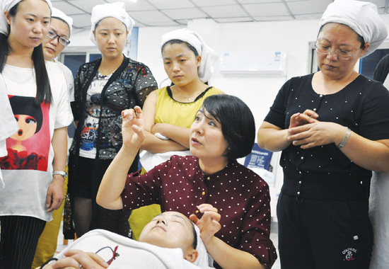 昨日,30来名妇女正在市农民培训学校参加美容师的培训。近年来,随着女性对脸部保养观念的改变,我市美容市场十分热门,美容师供不应求,市人力社保局因势利导在农民培训学校开设了政府买单的美容师专业,深受年轻妇女青睐。