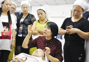 昨日,30来名妇女正在市农民培训学校参加美容师的培训。近年来,随着女性对脸部保养观念的改变,我市美容市场十分热门,美容师供不应求,市人力社保局因势利导在农民培训学校开设了政府买单的美容师专业,深受年轻妇女青睐。