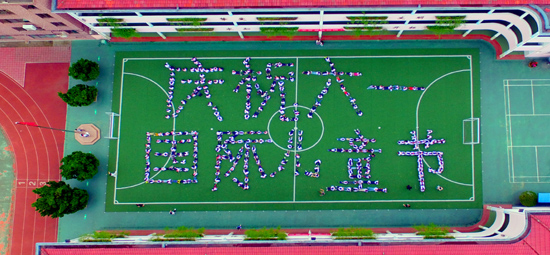 5月30日,东圃小学在举行完升国旗仪式后,一些孩子在操场上用身体排列出“庆祝六一国际儿童节”字样,表达对自己节日的祝福。