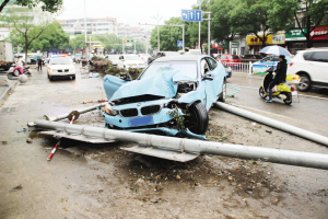 隔离花坛、交通告示牌、路灯被一辆宝马撞了个稀里哗啦