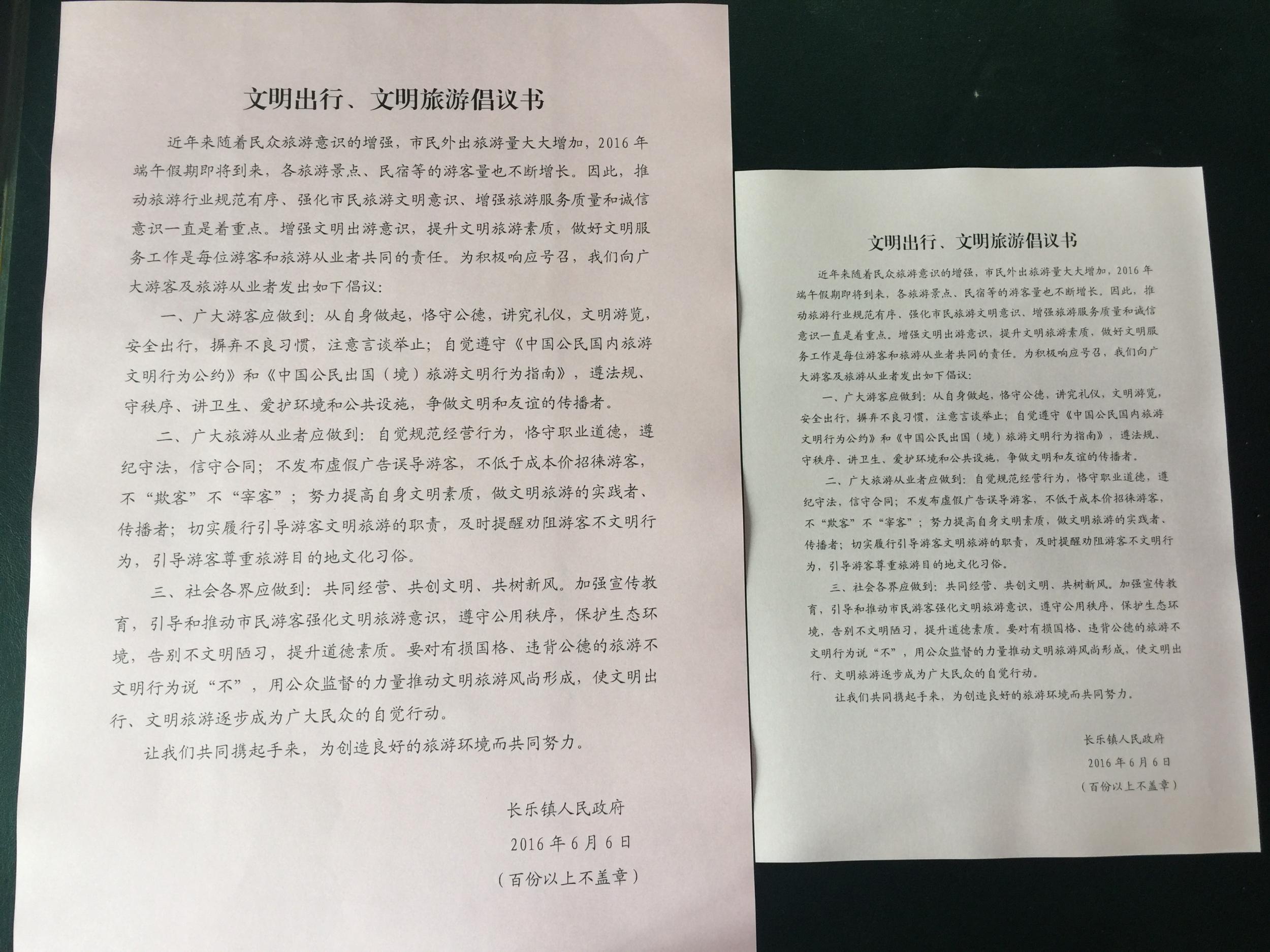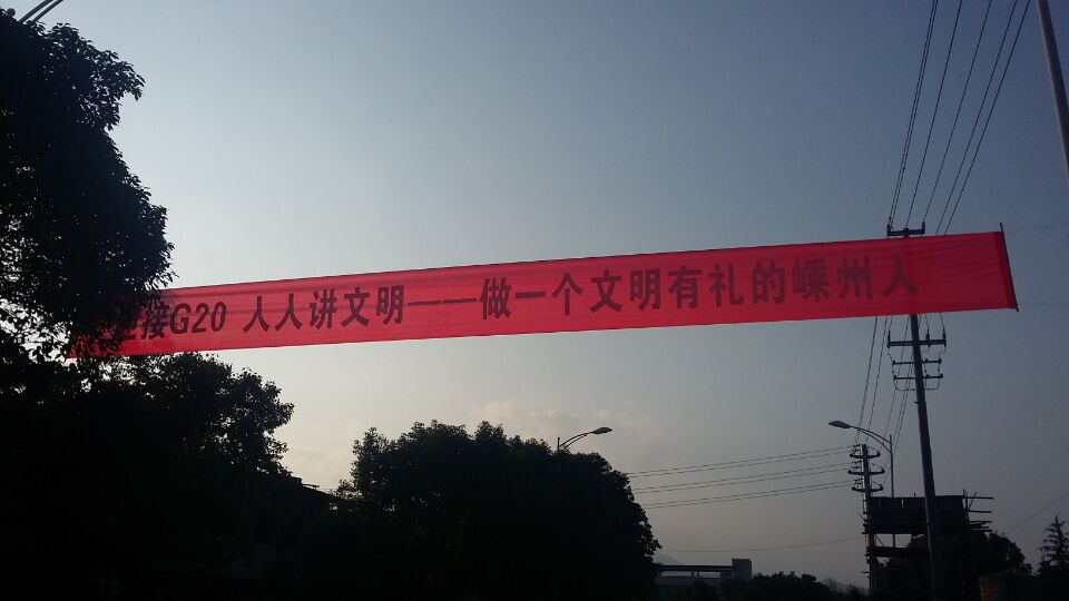 为迎接端午,过一个文明端午,我镇特意制作横幅,在主要道口悬挂“迎接G20 人人讲文明——做一个文明有礼的嵊州人”、“文明出行、文明旅游、文明服务、文明礼仪”等内容的横幅,渲染文明端午的环境氛围。我镇还特意制作《文明出行、文明旅游倡议书》并张贴,倡导文明端午,做一个文明有力嵊州人。