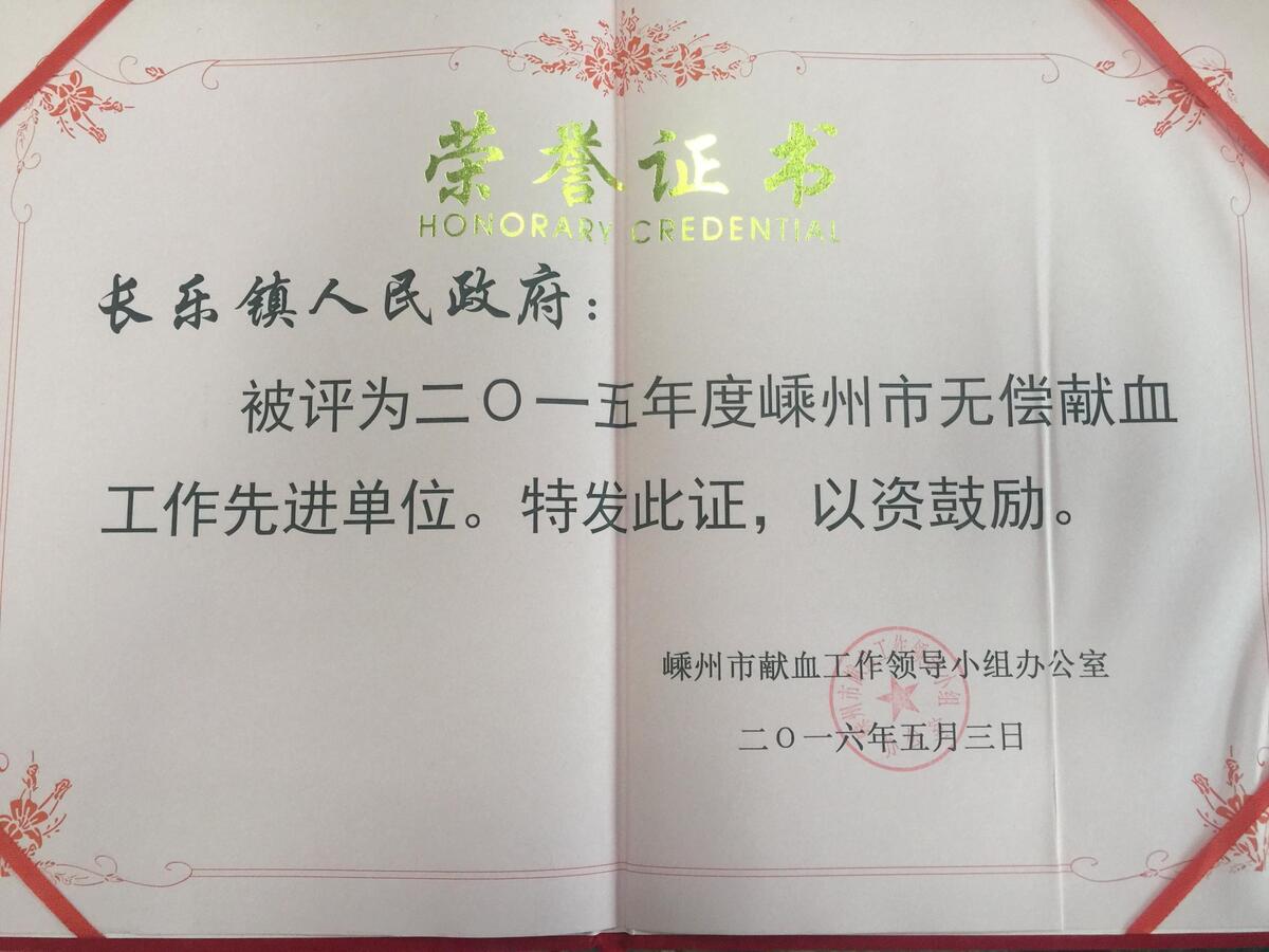 6月16日上午,长乐镇参加了庆祝第十三个“6·14世界献血者日”暨全市无偿献血工作表彰大会。本次会议有市领导钱群飞,宣传部副部长、红十字会、团市委、卫计局等主要负责人和分管负责人参加。大会进行了表彰,长乐镇被评为2015年度嵊州市无偿献血工作先进单位并授予了荣誉证书。2015年,我镇计划献血量为27600ml,并在去年年底完成计划任务数。今年我镇将再接再厉完成献血量,积极推动全市献血事业的健康发展。
