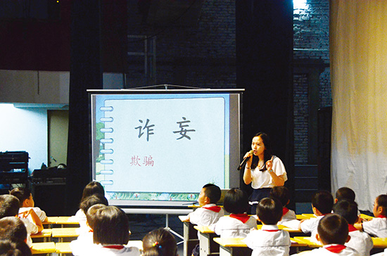 在活动中,育英小学钱迷和商伟利两位老师开出了两堂国学研讨课。钱迷老师执教的《弟子规·信》,从“解字”入手,引出“信”为“人言”,“人言”首要为“诚信”,由此导入新课学习,并对照“规训”主动设疑:何为“言出有信”?并引出要去“诈”(欺诈)、去“妄”(自夸)、去“佞巧”(花言巧语)的教理文脉。如此安排教育内容,显得有条不紊,思路明晰。教学中,钱老师还配以《狼来了》《狐狸和乌鸦》及孩子们在校园生活中的具体事例,展开解读,让一年级小朋友对“信”的重要性和如何在“语言”中落实,有了一个具体而清晰的认识。