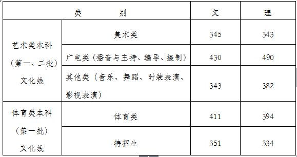 艺术、体育类本科文化分数线: