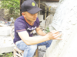 正是午后,应见江弯着身子在工场里雕刻“吉庆有余”石雕作品。头上是热辣辣的太阳,眼前是四处飞舞的粉尘。两年前,绍兴市非遗(嵊州石雕)传承人、应见江的父亲应汉军就打算把嵊州溪山第一楼的石雕作品完完整整复制出来。溪山第一楼石雕作品创作于清朝中期,上面有很多博古图案,如吉祥如意、岁岁平安等,可谓近代石雕之精品。可惜,东面和西面的照壁有很多已经开始风化了,再过几十年,这些图案将慢慢消逝。
