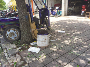 接到来电后,记者对剡兴路、四海路等地进行实地走访,发现“门前三包”落实情况确实不理想。从东桥南端往城南方向走,记者在剡兴路西侧的一家电瓶车商店门口看到,绿化树下堆放着油桶,旁边的塑料袋内有垃圾。而像这样的情况,在该路段并非个例。在另一家电瓶车商店门口,停满了新的电瓶车。除新车停在人行道上“展示”外,记者还看到,有的店门口并排排列着多辆旧电瓶车,车辆下方用铁链拴在一起,还挂上了锁。此外,该路段绿化处的卫生状况也不容乐观。有的绿树下扔着饮料瓶、纸屑、烟蒂,有的扔着吃剩的玉米壳,上面有苍蝇盘旋。