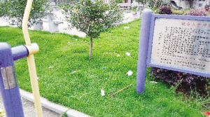 拍摄地点:江滨西路边上,新光制药大门对面的健身点,活动场地及周边草坪上垃圾随处可见,很不雅观。
