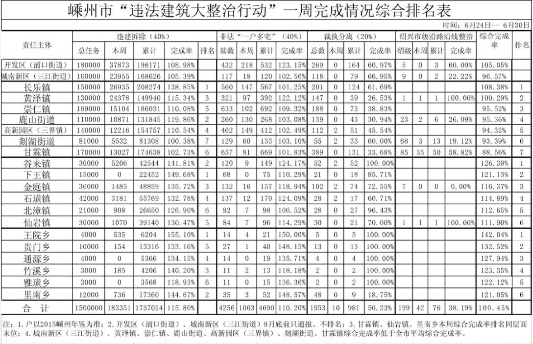 嵊州市“违法建筑大整治行动”一周完成情况综合排名表