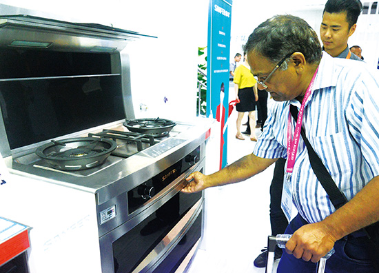 7月8日至昨日,2016年第18届中国(广州)国际建筑装饰博览会在广州市海珠区举行,我市的浙江帅丰电器有限公司等10多家厨具企业组团参展,F16蒸神器等系列集成灶具深受国内外采购商的青睐。图为国外客商正在选购帅丰集成灶。