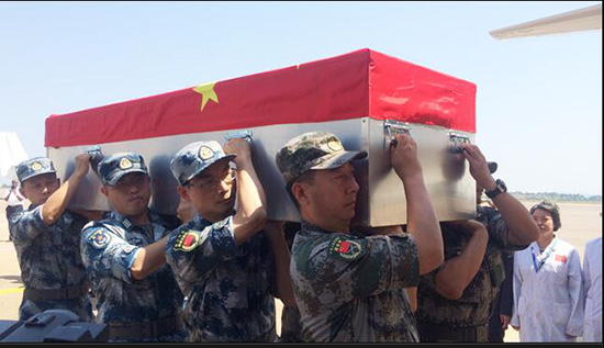 7月19日,在乌干达恩德培国际机场,中国军队工作组为烈士李磊、杨树朋灵柩举行起灵仪式。当地时间19日下午3时,接运烈士李磊、杨树朋灵柩的中国军队工作组空军飞机从乌干达恩德培机场起飞回国。