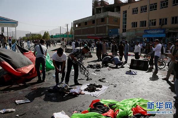 7月23日,在阿富汗首都喀布尔,人们在爆炸现场收拾遇难者的物品。新华社发(拉赫马特·阿利扎达摄)