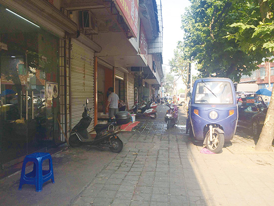 拍摄者的话:兴隆街一些商店门口,污水横流现象比较严重,而且随意将电动自行车、三轮车停放在门口,妨碍了行人正常通行。