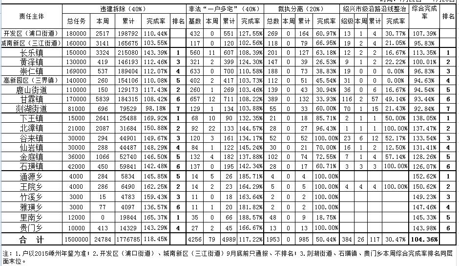 嵊州市“违法建筑大整治行动”一周完成情况综合排名表