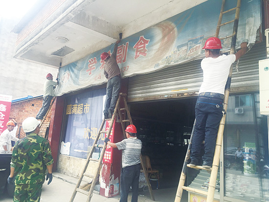 昨日上午,石璜镇联合城管、市场监管、交警等对集镇主要街道的钢棚、雨篷、破损广告牌、流动摊贩等进行综合整治。