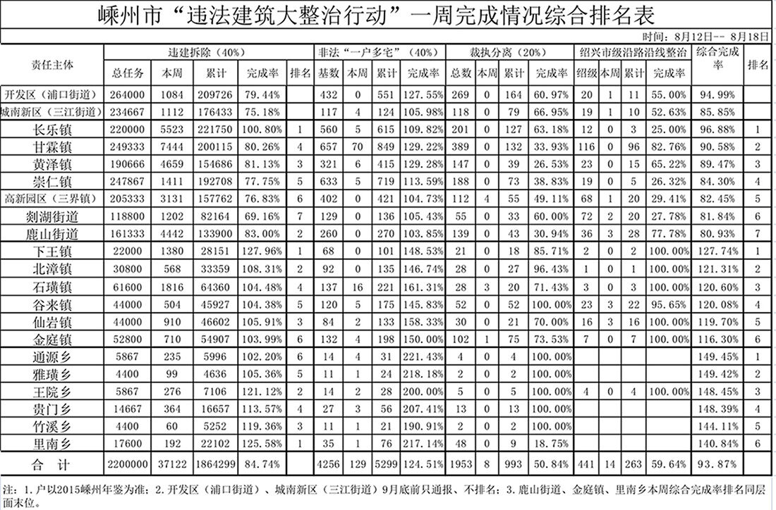 嵊州市“违法建筑大整治行动”一周完成情况综合排名表