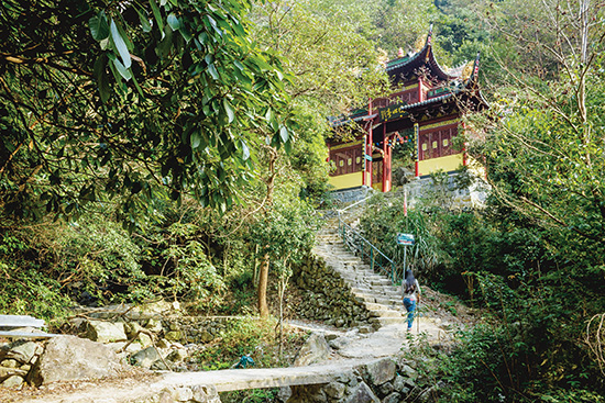 继续前行,便是白龙潭和洗心亭,亭后可见一道登山云梯蜿蜒直上,一汪清水映着一座石屋,一条山道雾蒙蒙,似乎真能洗净心灵的污浊。那陡然阶梯直穿云雾,似乎在告诉我们:走快一点,让久未运动的躯体重新焕发活力,出一身大汗,叹一声舒爽;走慢一点,享受森林氧吧带来的安逸悠然,吸进一口清新自然,呼出一口污浊烦恼。快慢由心,静心如我,这或许便是佛陀的考验。