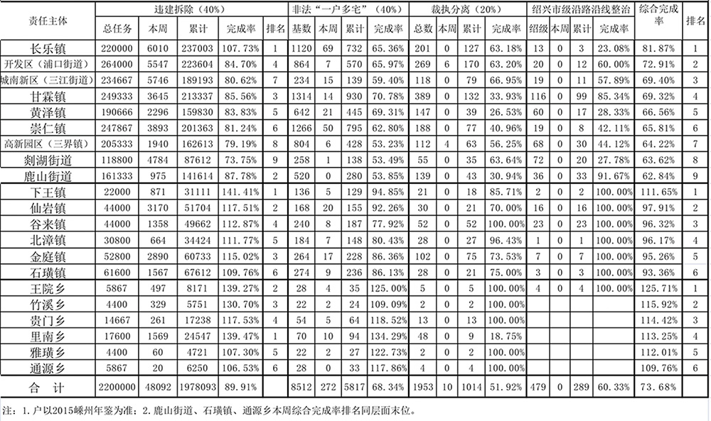 嵊州市“违法建筑大整治行动”一周完成情况综合排名表